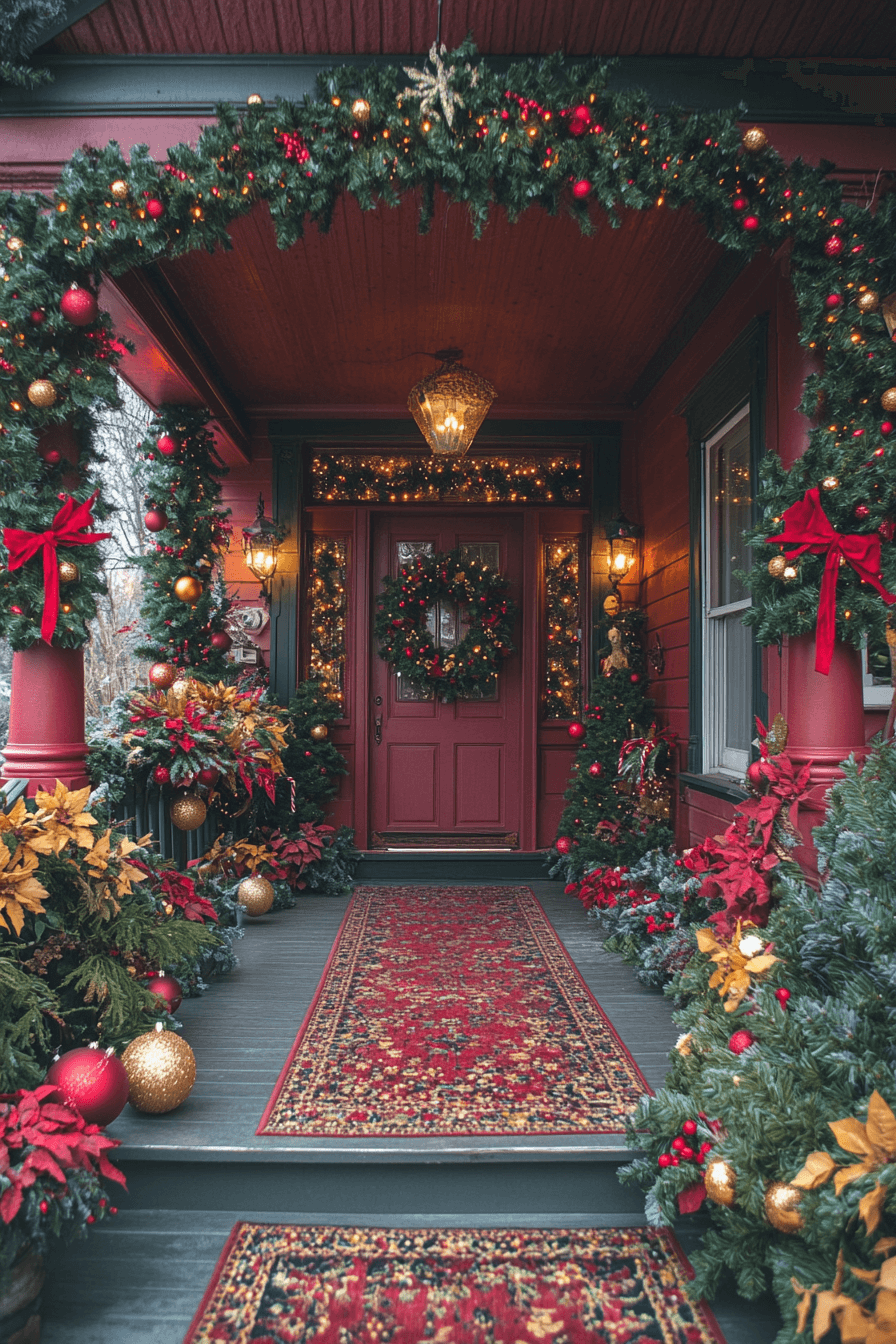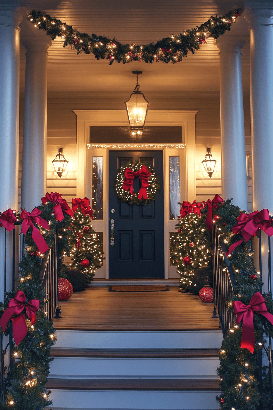 Tie your design together with front porch christmas decor highlighting ruby ribbons and soft gold. Bow-topped garlands and matching planters bring cohesion and color. Candlelight reflects off the red satin for cozy radiance. It’s the perfect blend of passion and polish.