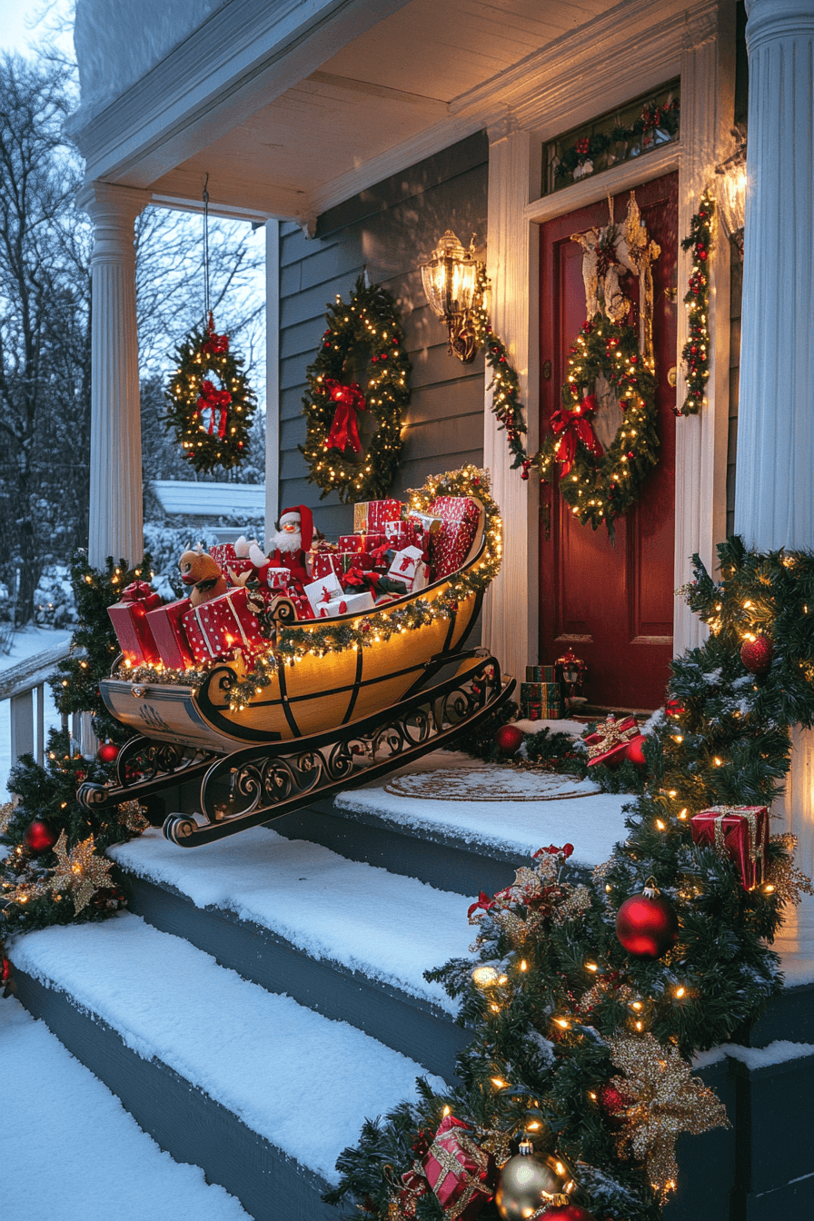 Bring storybook nostalgia to life with front porch christmas decor featuring a vintage sleigh display. Fill it with pine boughs, bells, and wrapped boxes for instant magic. A few flickering candles nearby make it glow. The design feels whimsical, timeless, and heartfelt.