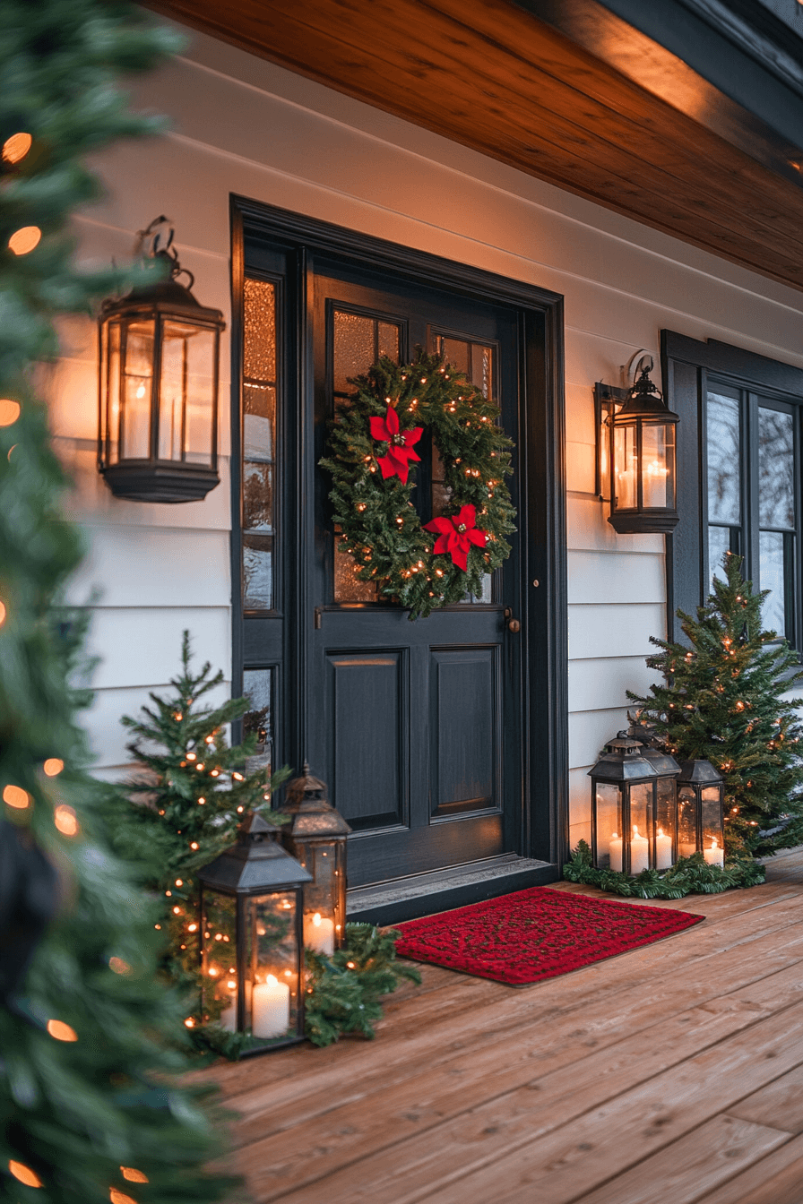 Highlight tradition through front porch christmas decor centered on a laurel wreath. Choose glossy leaves, subtle berries, and a satin bow for understated elegance. Add paired lanterns on either side for balance. The result is timeless sophistication that never feels overdone.
