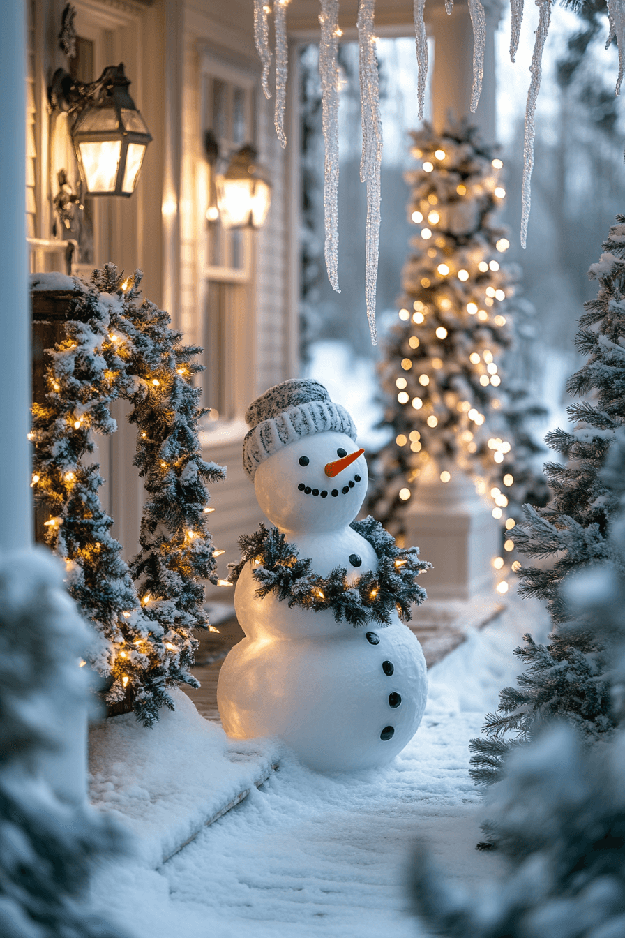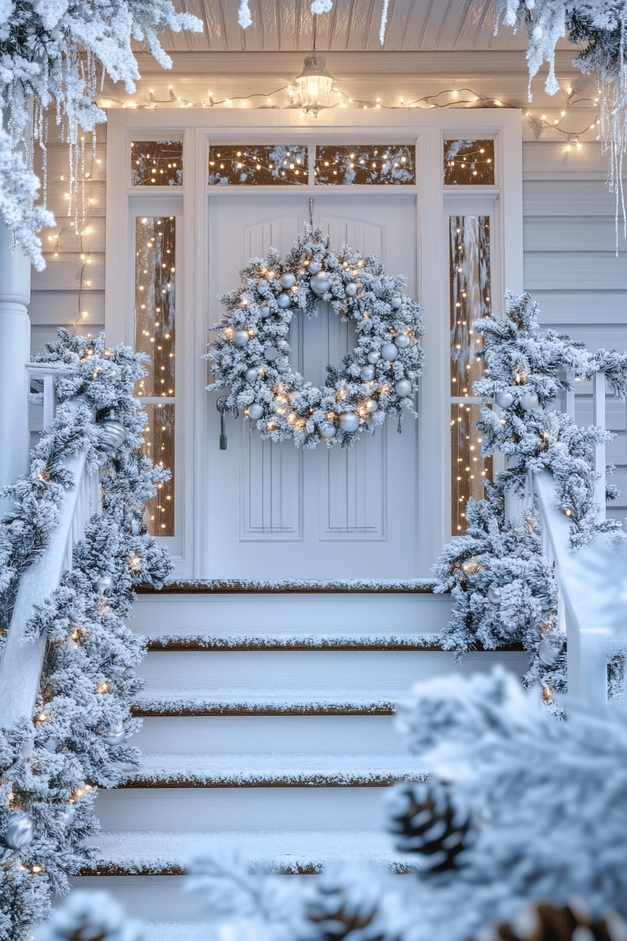Welcome the season with front porch christmas decor that glistens like a frost-kissed morning. Layer garlands dusted with faux snow, add silver bows, and let white twinkle lights trace your doorway. Each sparkle feels crisp and serene, turning your home into a cozy winter haven. A wreath of icy pinecones finishes the magical scene.