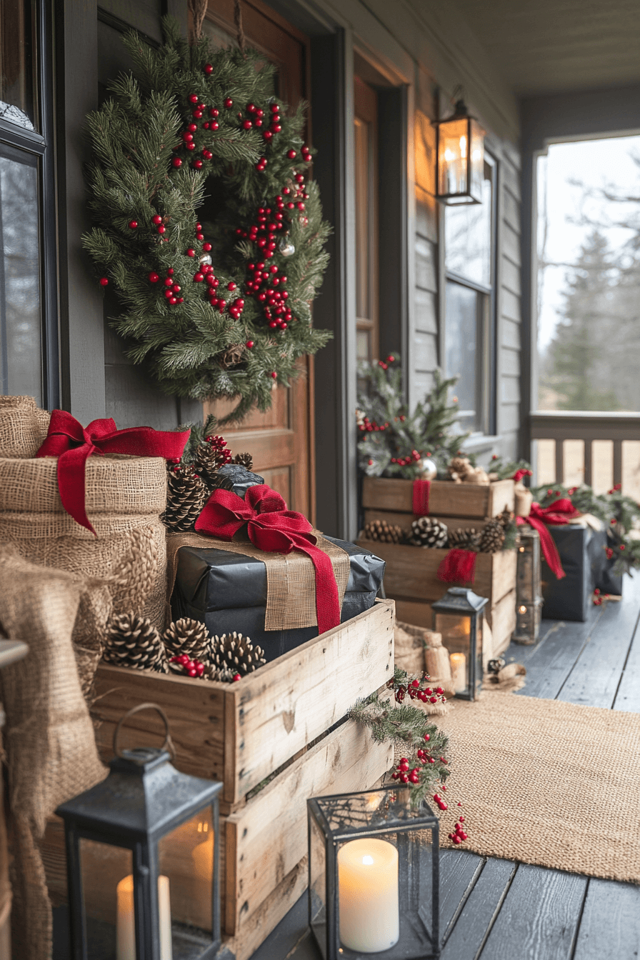 Glow softly this season with front porch christmas decor centered on amber lanterns and wooden accents. The honeyed light warms the night air, creating instant calm. Add evergreen sprigs for scent and contrast. The rustic mix feels both nostalgic and timeless.
