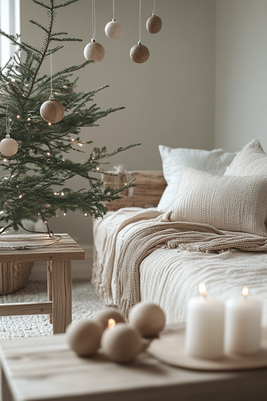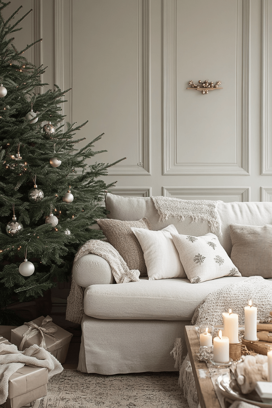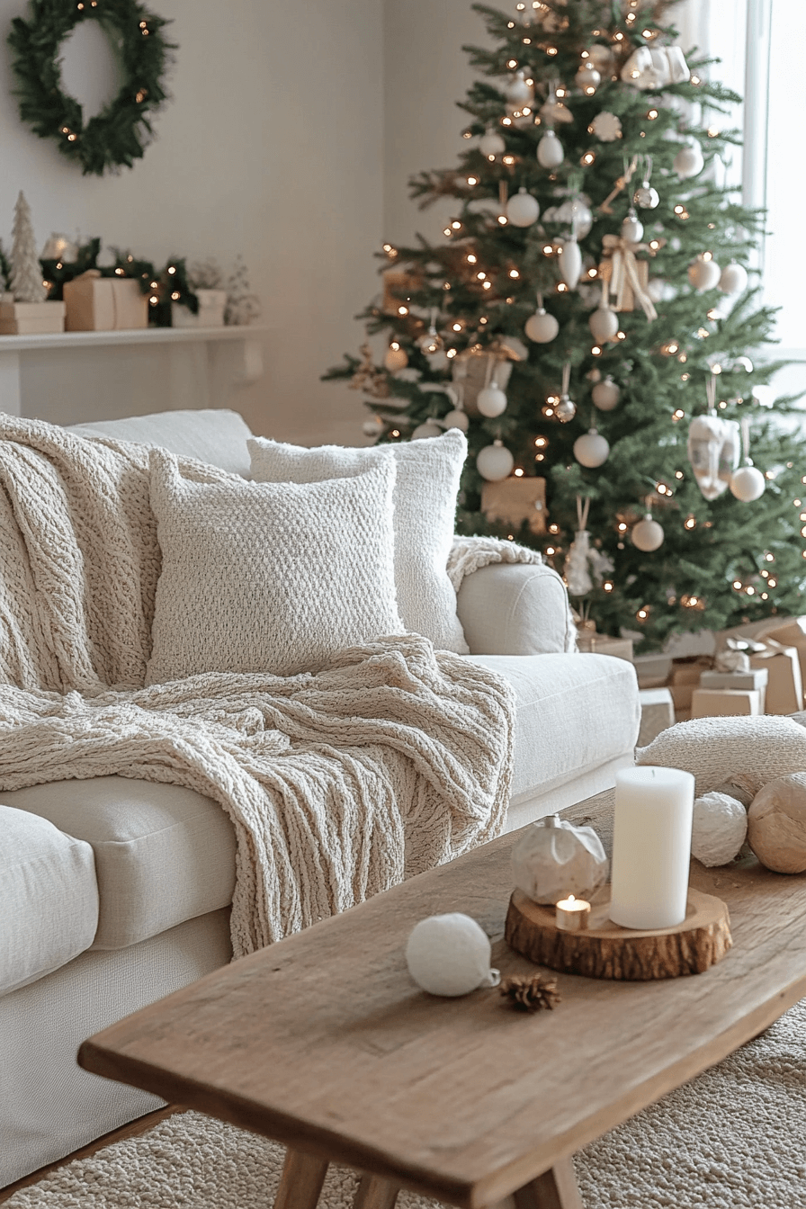 Soft beige tones and creamy layers create a warm, welcoming atmosphere. The balance within minimalist Christmas decor makes the space feel both grounded and serene. Textured blankets and neutral candles tie the palette together. Every shade blends seamlessly into the next.