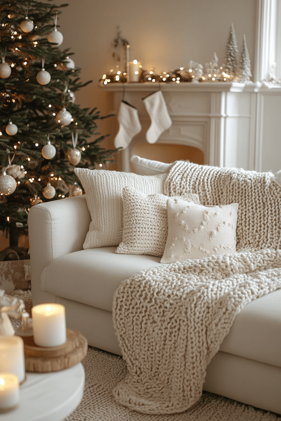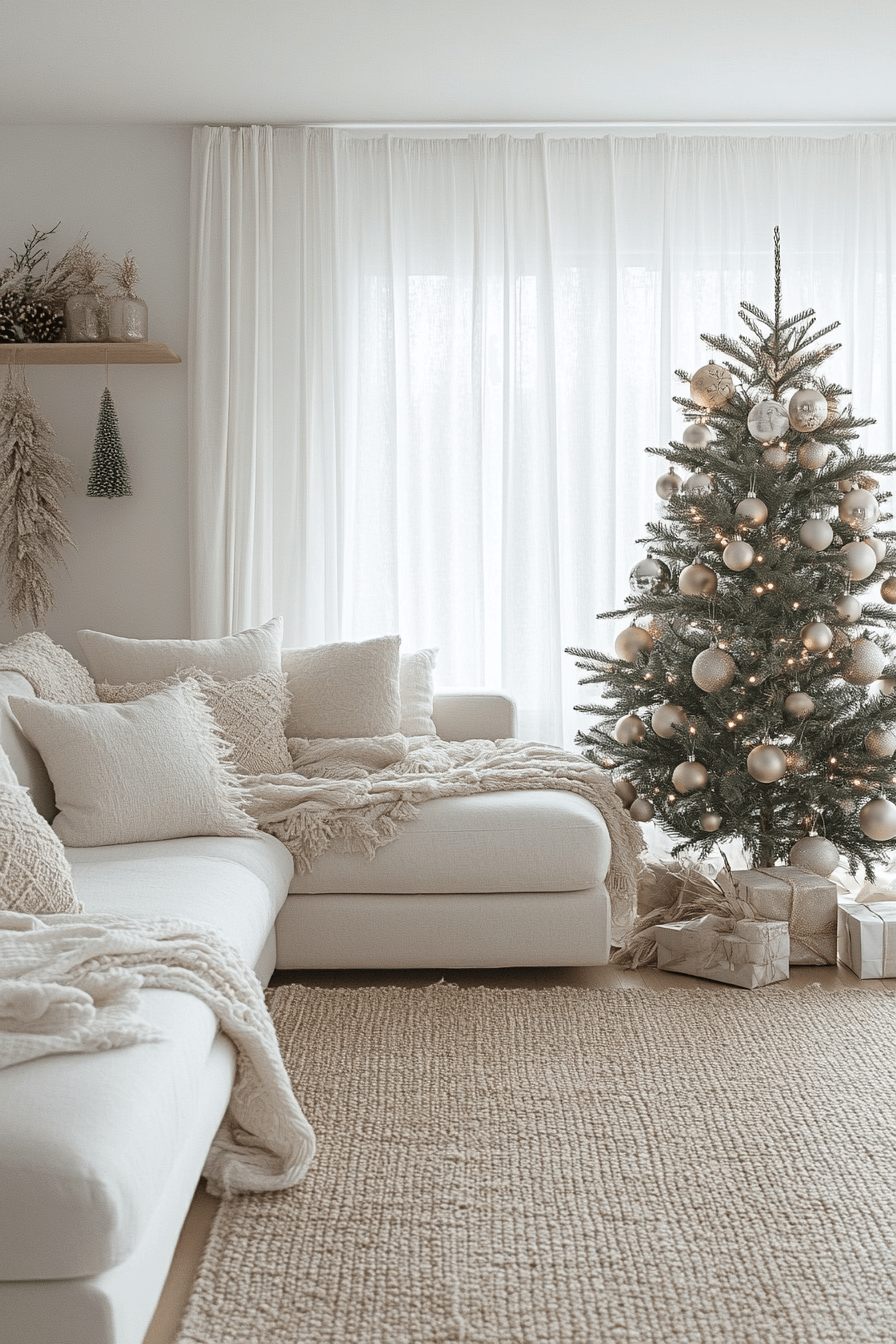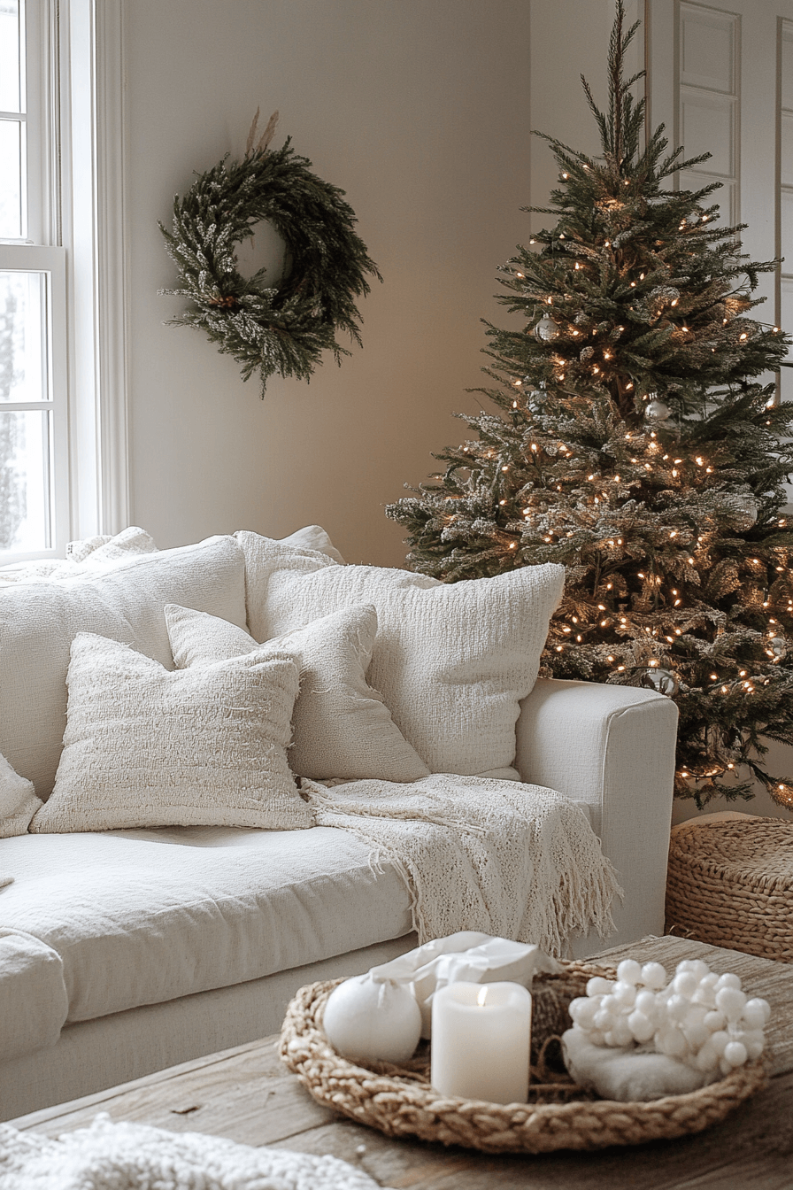 Soft beige tones and creamy layers create a warm, welcoming atmosphere. The balance within minimalist Christmas decor makes the space feel both grounded and serene. Textured blankets and neutral candles tie the palette together. Every shade blends seamlessly into the next.