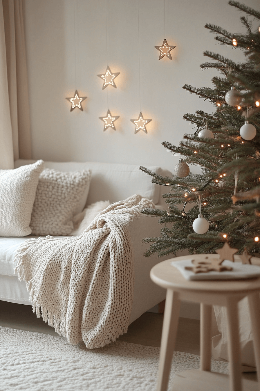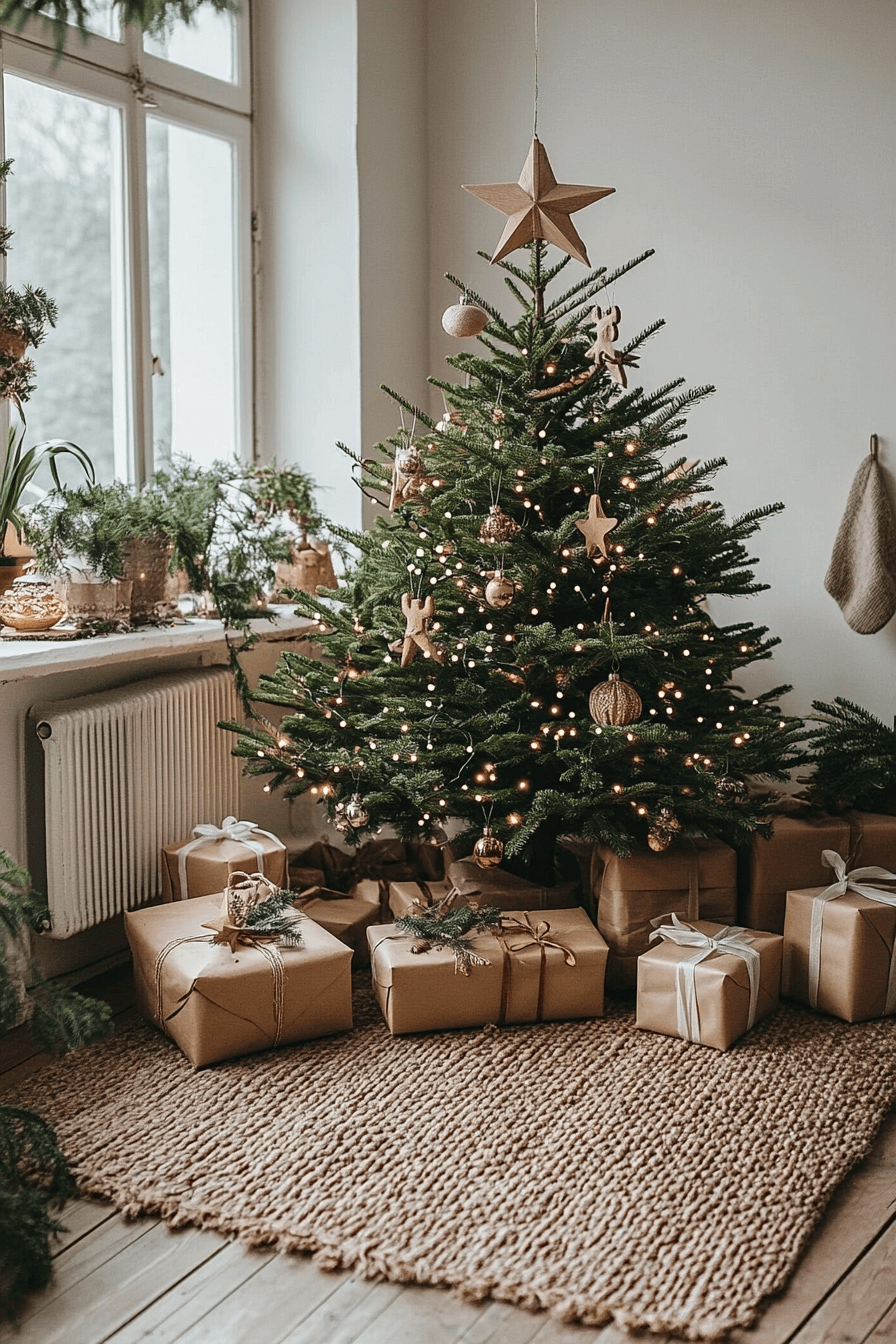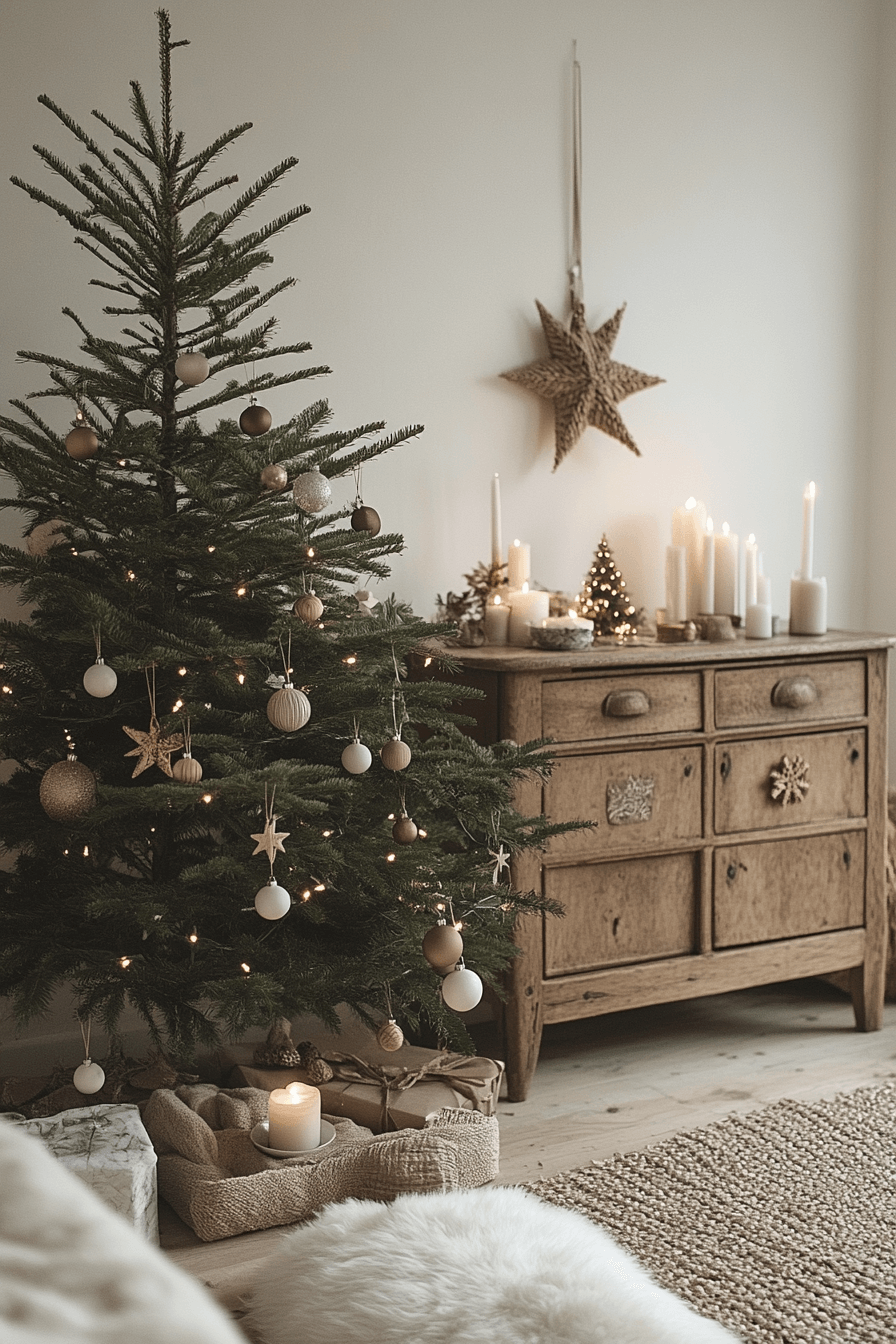 A Nordic-inspired tree glows with gentle restraint and timeless charm. With minimalist Christmas decor, even a few ornaments can tell a story of calm sophistication. Paper stars, pine sprigs, and straw accents add organic texture without clutter. The overall mood is serene and cozy, like a snowy cabin at dawn.