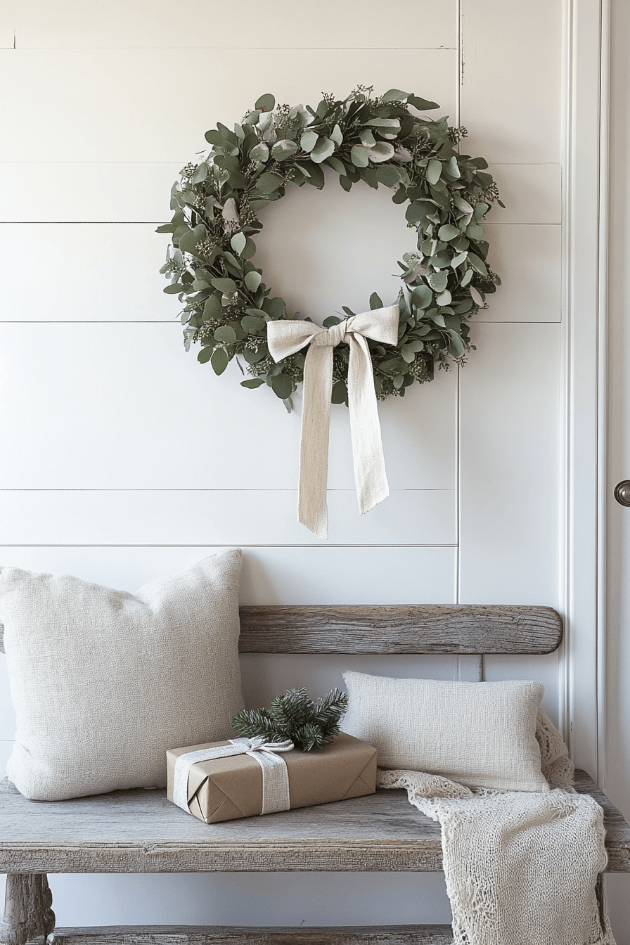 A wreath made of pine and olive brings modern freshness to your space. The beauty of minimalist Christmas decor lies in its use of natural form and texture. No ribbons, no clutter — just understated grace. The gentle greens evoke renewal and peace.