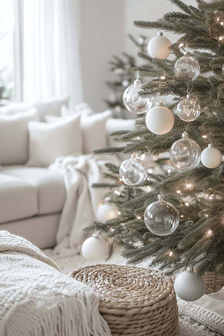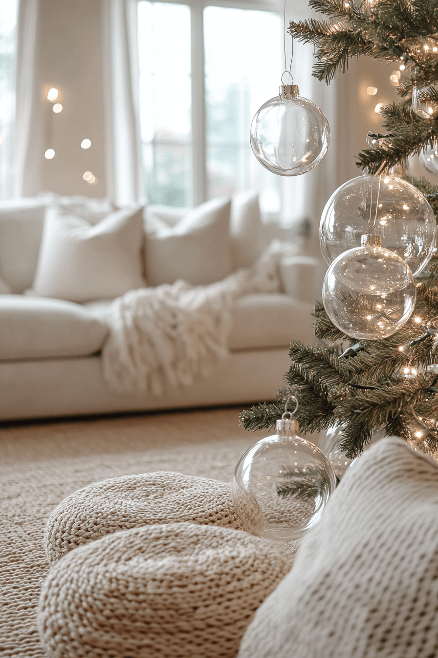 Clear glass ornaments catch the light with an elegance that feels weightless. In minimalist Christmas decor, transparency becomes its own form of sparkle. The reflections dance softly across your space. It’s pure, subtle, and endlessly beautiful.