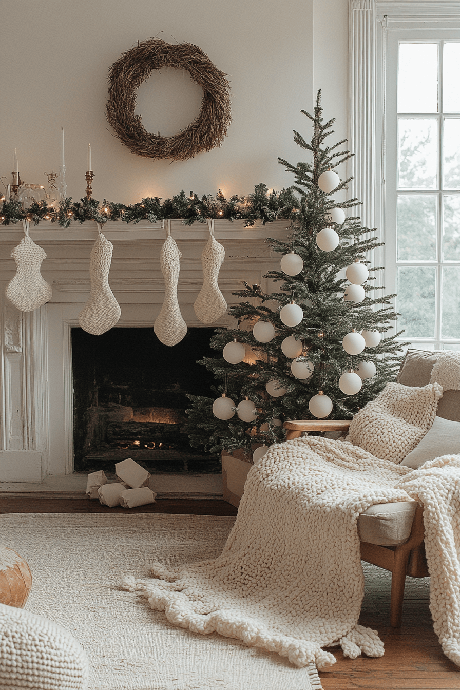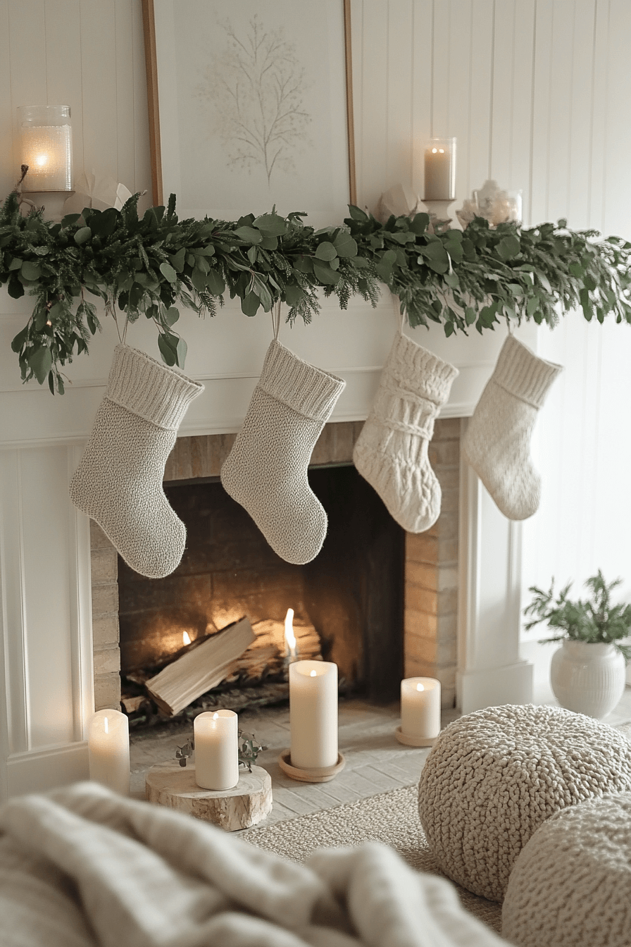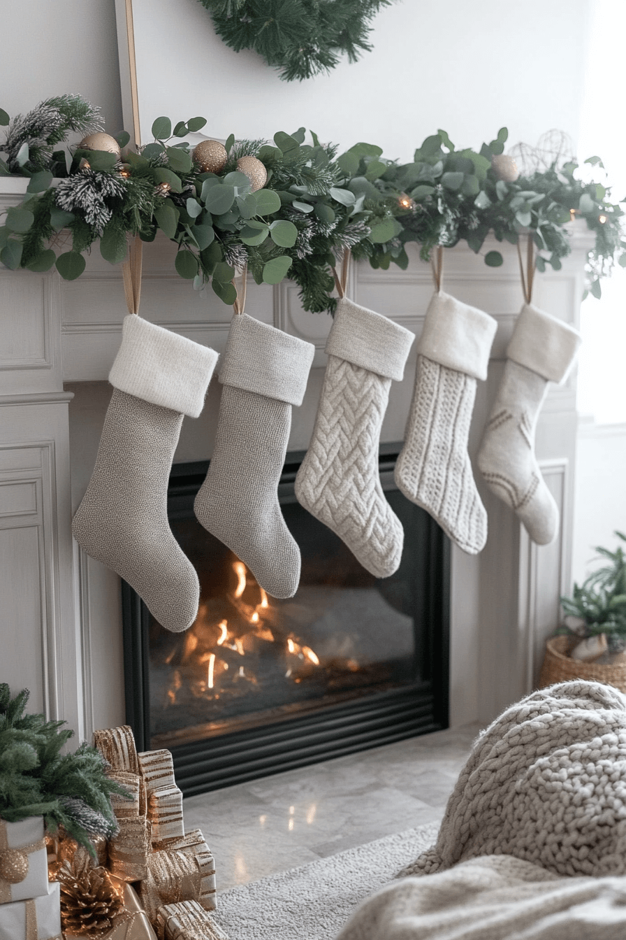 Neutral-toned stockings made of wool or linen add understated holiday grace. Their texture complements the calm aesthetic of minimalist Christmas decor perfectly. Hung beside simple greenery, they tell a story of handmade beauty. The palette feels soft and timeless.