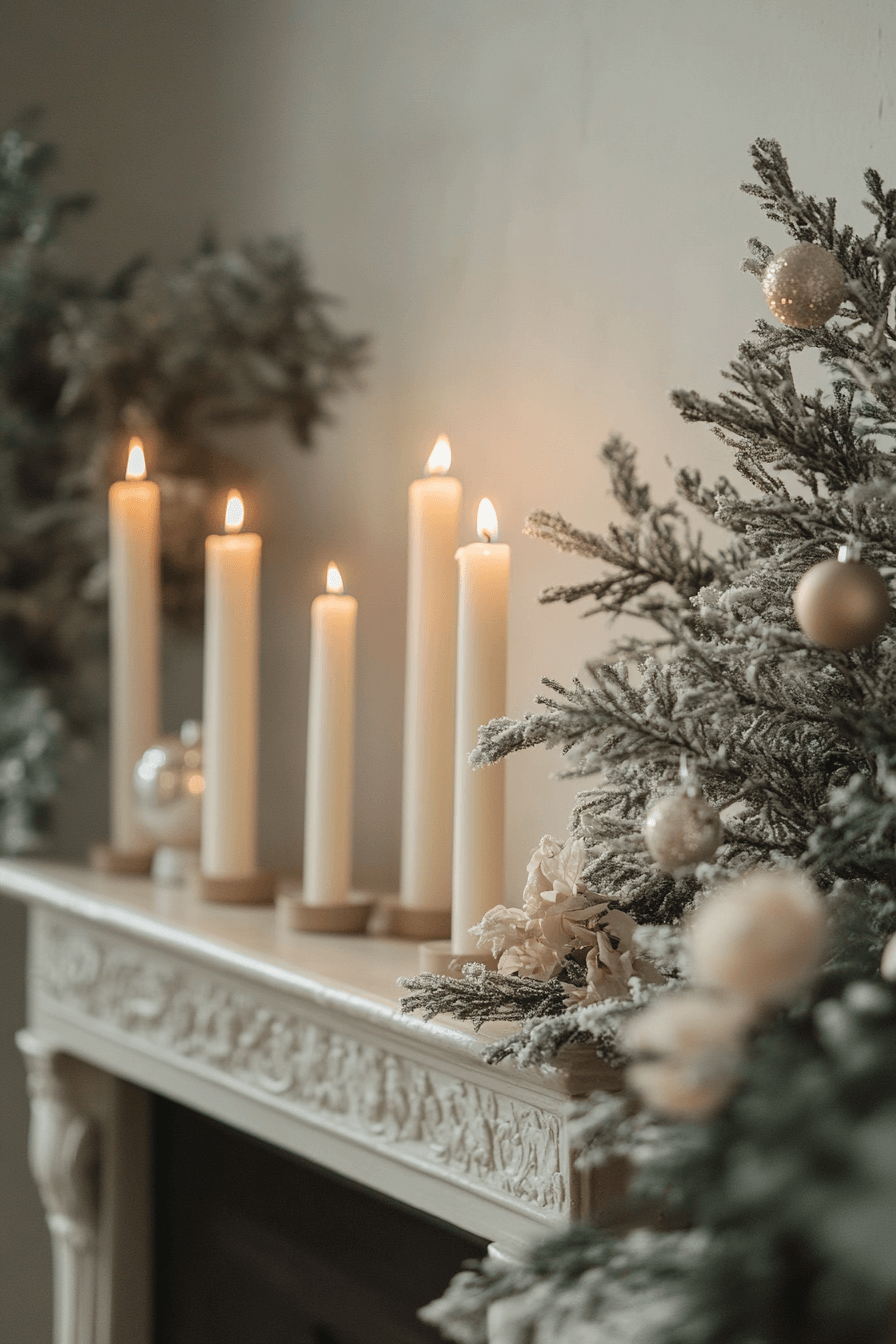 Soft gray tones blend with natural greens for a look that feels modern and restful. The beauty of minimalist Christmas decor shines in this tranquil palette. Candles and ceramic pieces add warmth to the muted hues. The atmosphere feels grounded, calm, and stylish.