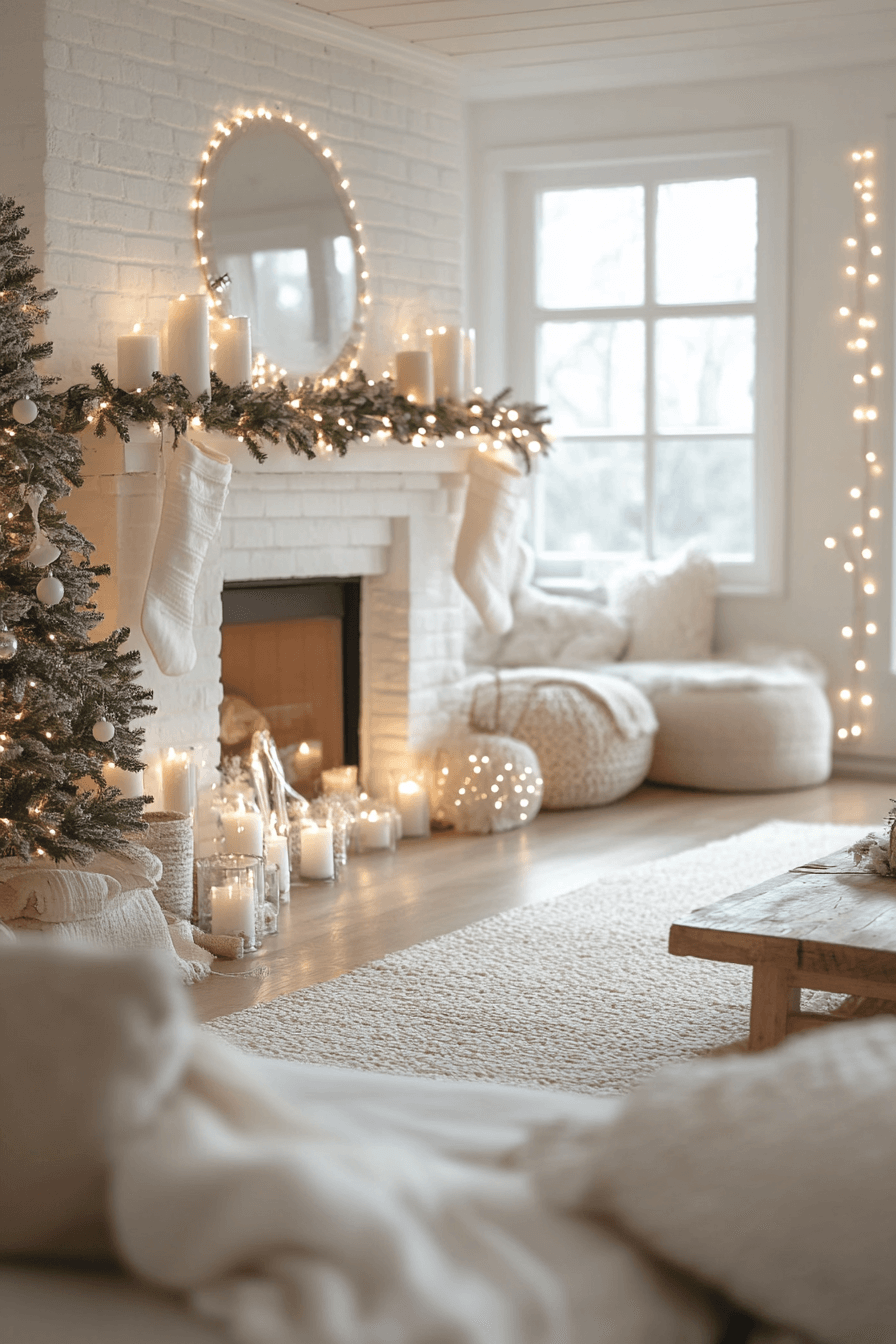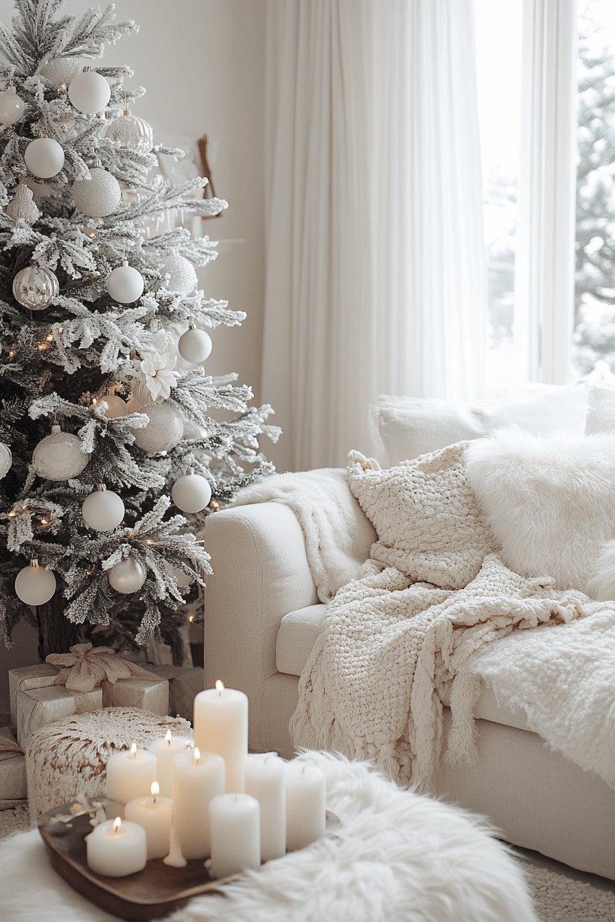 White layers, glass accents, and golden candlelight create an airy winter retreat. Through minimalist Christmas decor, each hue and texture works in harmony to evoke calm. The space feels luminous yet quiet, like morning frost on glass. Soft shadows add depth, balancing warmth and cool serenity.