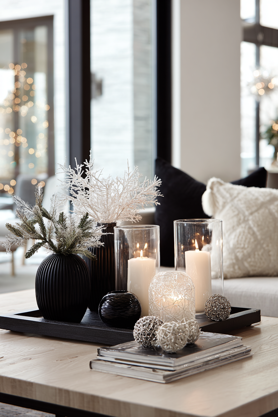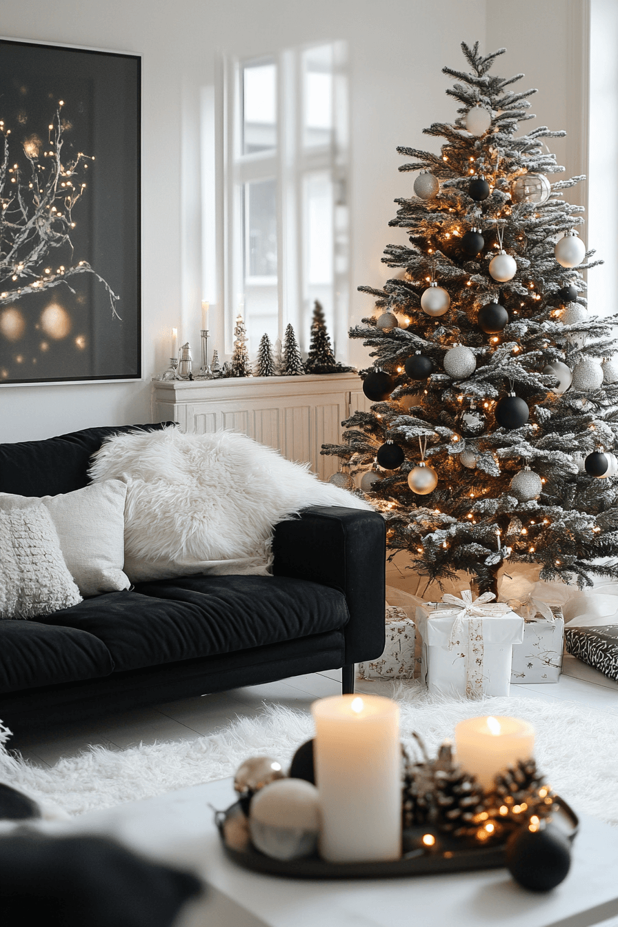 Monochrome tones bring striking contrast and timeless sophistication. Minimalist Christmas decor thrives on this union of black, white, and gray. The palette feels bold yet harmonious, polished yet warm. Every accent becomes more meaningful against the calm backdrop.