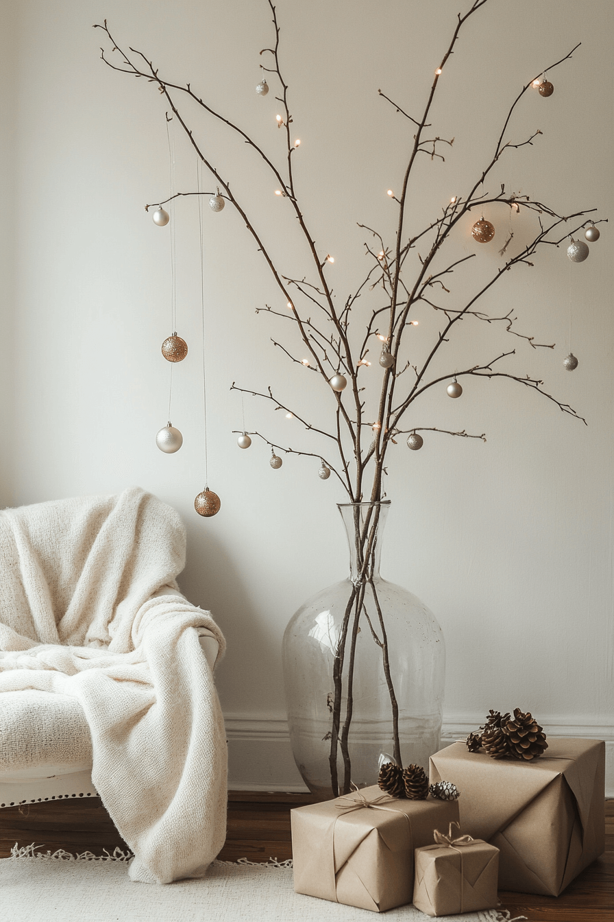Branches in a simple vase capture the poetry of nature in its rawest form. This touch of minimalist Christmas decor feels sculptural and alive. A single ornament or twinkling strand of lights adds subtle sparkle. The balance of form and emptiness invites peace.