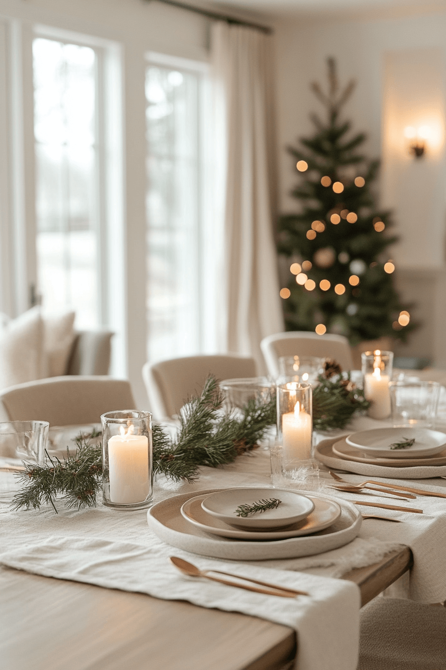 Neutral linens, soft plates, and greenery define an intimate table made for connection. With minimalist Christmas decor, elegance comes from space, not excess. Gentle textures and dim lighting set a mood of calm sophistication. Each setting feels considered and full of warmth.