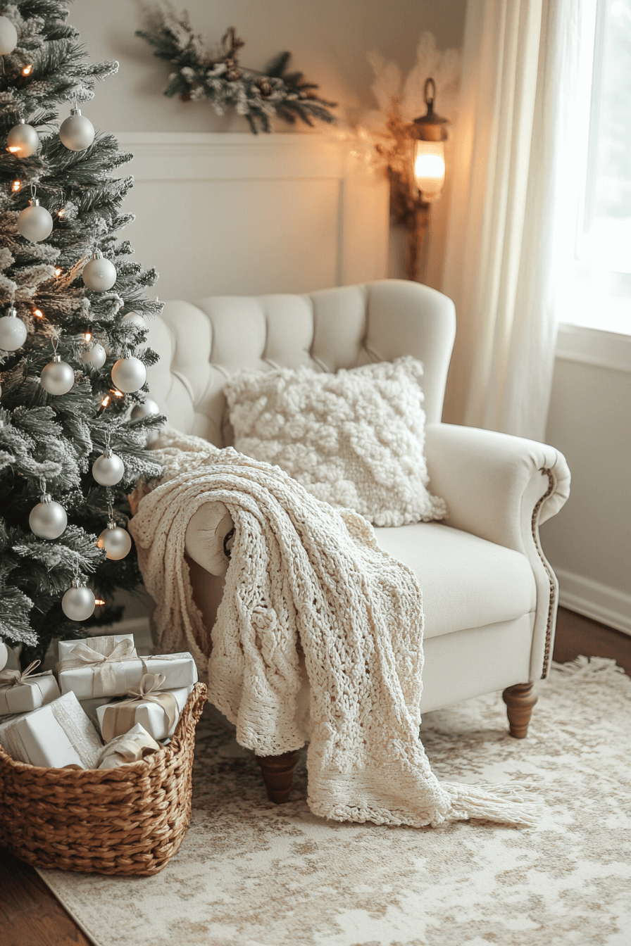 Even a small reading corner can feel intentional and serene with thoughtful design. Minimalist Christmas decor transforms the space through gentle lighting and layered comfort. A single candle, a wool blanket, and a sprig of pine complete the mood. It’s cozy without clutter, stylish without trying.