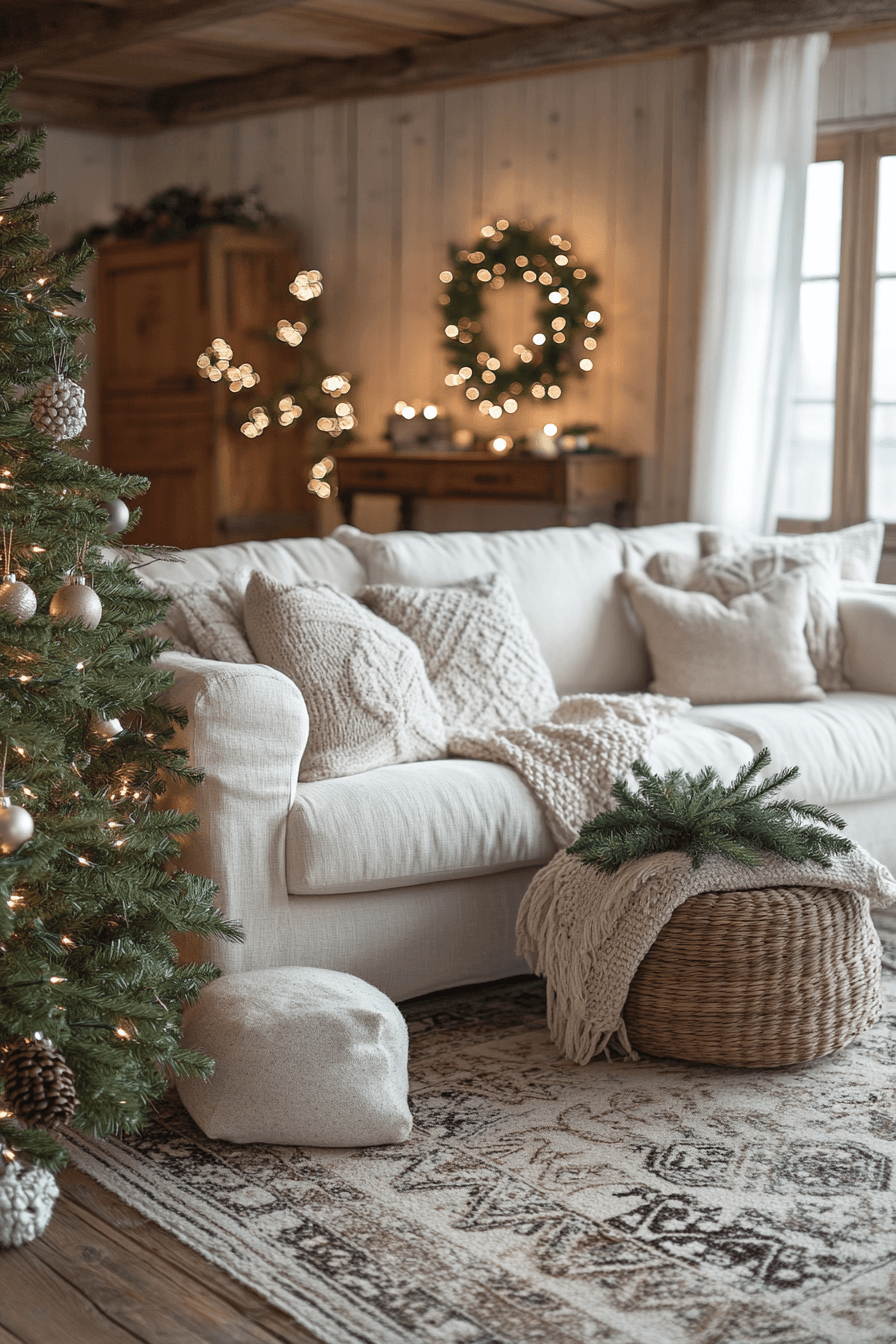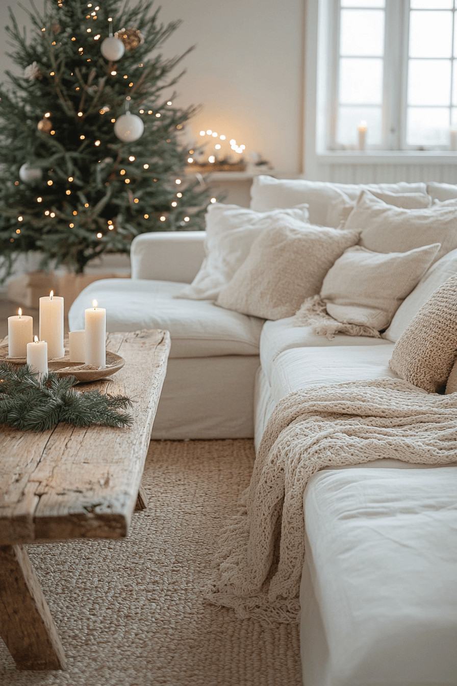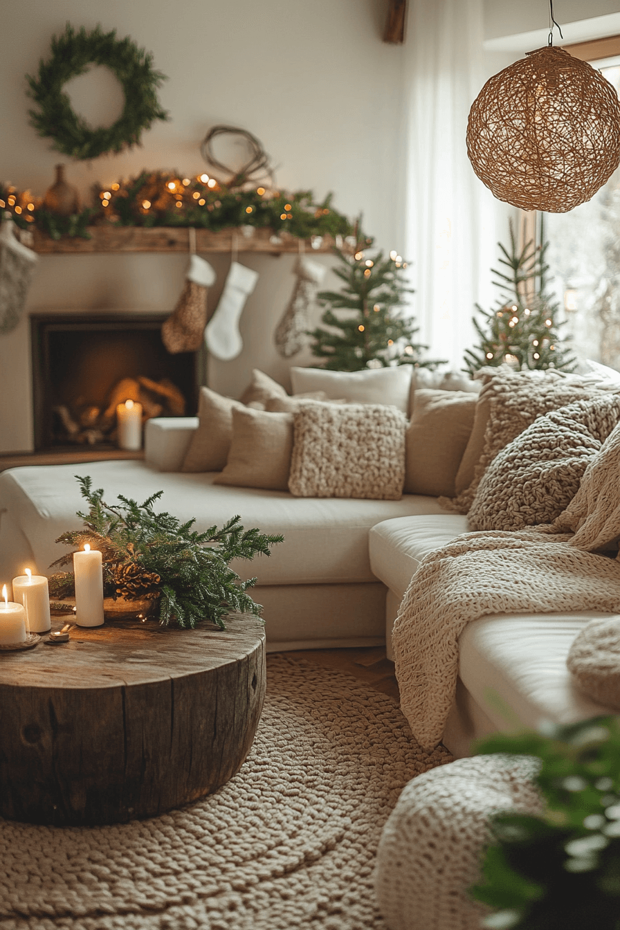 Soft candlelight, pine branches, and neutral tones fill your home with quiet comfort. The organic layers of natural Christmas decor create a space that feels peaceful and pure. Wooden accents and woven textures make everything glow with warmth. Every detail whispers understated beauty.