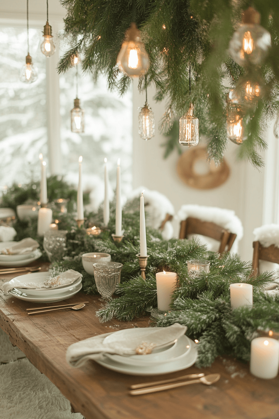 Frosted pinecones, cedar garlands, and linen runners bring nature to your holiday table. The subtle elegance of natural Christmas decor turns every meal into an experience. Candlelight glows across soft tones and textures. It’s timeless, cozy, and welcoming.
