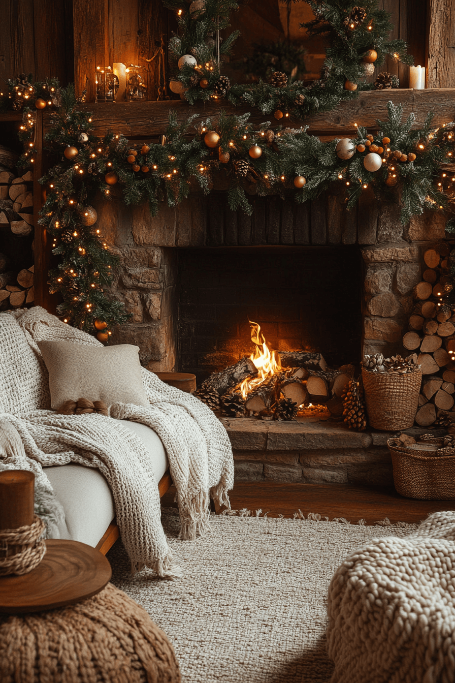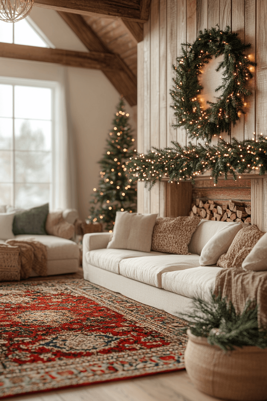 Snow-kissed cedar, woven blankets, and wood beams bring the beauty of winter indoors. Each layer of natural Christmas decor adds quiet sophistication. It’s a look that feels cozy yet elevated. The textures and light complement each other perfectly.