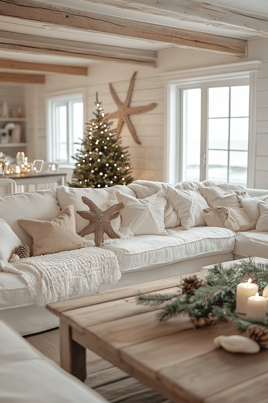 Soft driftwood, fresh evergreens, and warm whites form a tranquil mix. This version of natural Christmas decor captures coastal serenity with holiday charm. It’s airy, pure, and deeply relaxing. Every detail feels sunlit and calm.
