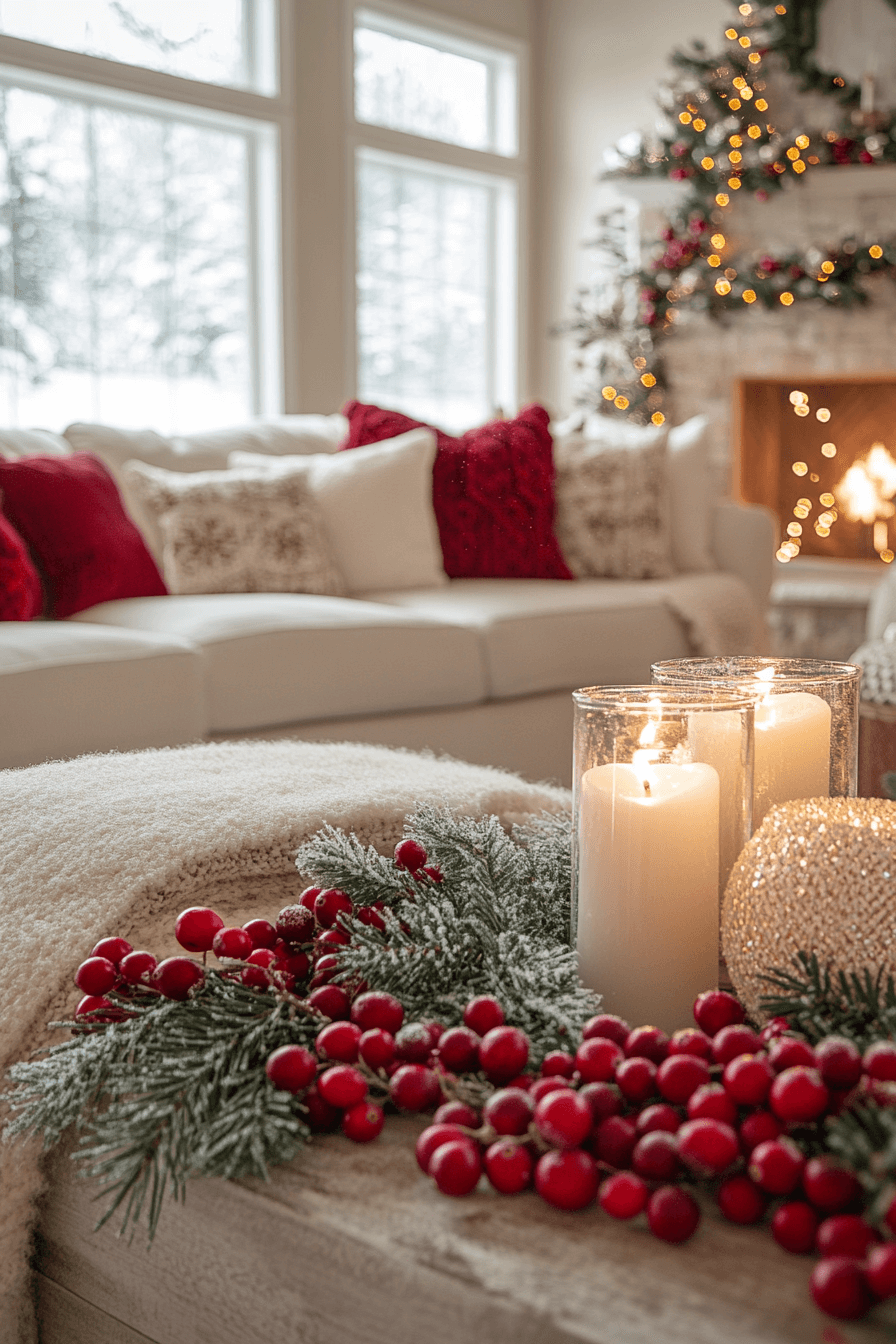 Rustic burlap, pine sprigs, and bright berries combine for an inviting festive touch. The organic warmth of natural Christmas decor makes every detail come alive. The red tones add cheer while staying balanced and earthy. Candlelight completes the glow with elegance.