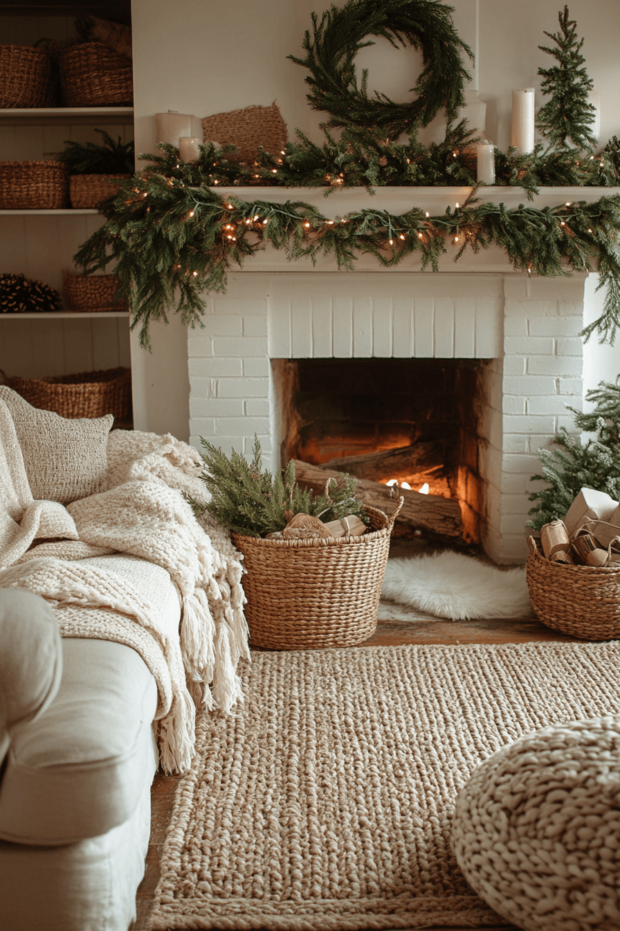 Woven baskets brimming with greenery and pinecones add warmth to your décor. The textures of natural Christmas decor feel cozy and approachable. Each basket tells a story of handmade simplicity. It’s rustic charm at its most inviting.