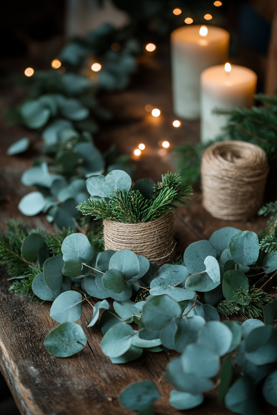 Eucalyptus garlands, linen fabrics, and soft woods create a holiday aesthetic of minimal beauty. The simplicity of natural Christmas decor shines through every element. The design feels open, clean, and grounding. Subtle lights add just the right amount of magic.