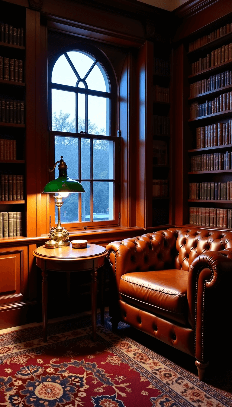 "Vintage living room interior with emerald green Chesterfield sofa, cognac leather wingback chair, brass floor lamps, and a mirror reflecting golden hour sunlight."